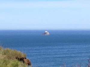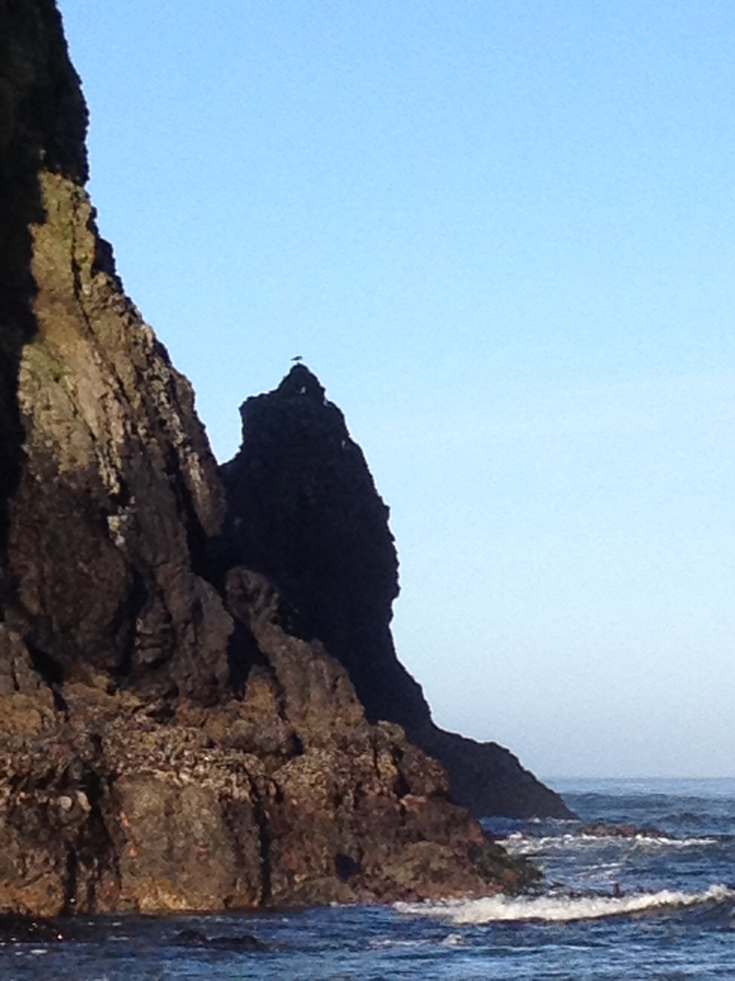 At the very top of that rock you can faintly see the outline of a Puffin. That was the closest they landed to us. They pretty much stay on the west side (ocean side) of Haystack.