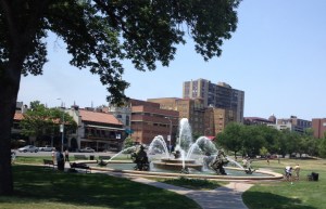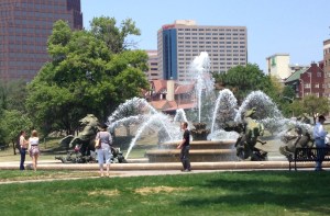 Fun fact: One of the dolphins on the J. C. Nichols fountain was not the original up until last year. This went unnoticed until 2010, when a man from Florida called the park officials and told them he has one of their missing dolphins. Apparently a replica was made when the Nichols family purchased the 1910 Henri Greber fountain in the 1950s and discovered that one of the original nine pieces was missing, unbeknowst to the public. It was known to the public that the fountain was missing various parts and those were commissioned to be replaced, but someone up top kept it underwraps that an entire sculpture needed to be recreated. The missing dolphin was added last year and now the J.C. Nichols fountain is officially complete. Click here for full story: http://catherinesherman.wordpress.com/2010/07/10/mystery-of-the-fountain/