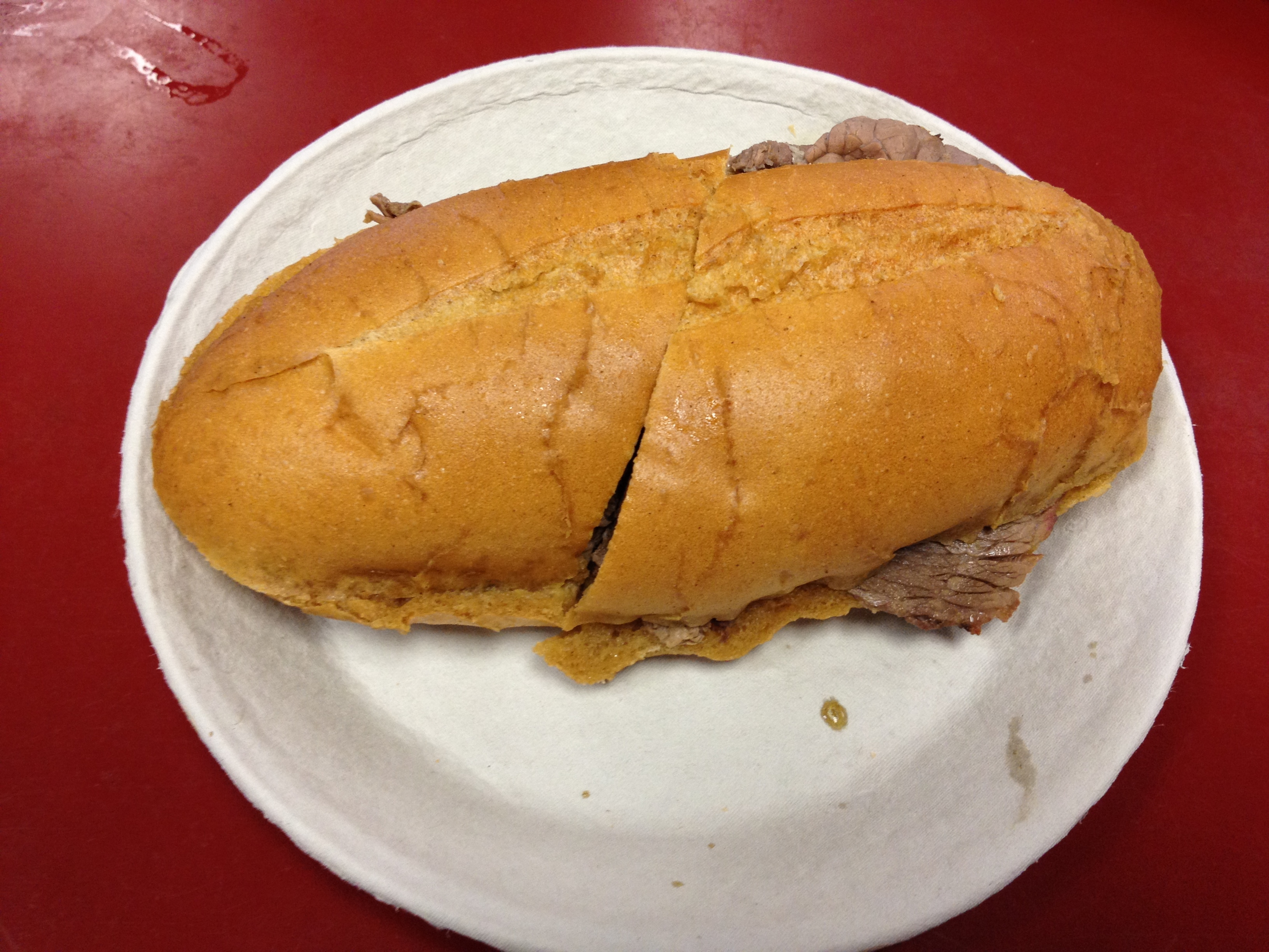 “Philippe’s “French Dipped Sandwich” is the specialty of the house and consists of either roast beef, roast pork, leg of lamb, turkey or ham served on a lightly textured, freshly baked French roll which has been dipped in the natural gravy of the roasts. Swiss, American, Monterey Jack or Blue cheese may be added.”
