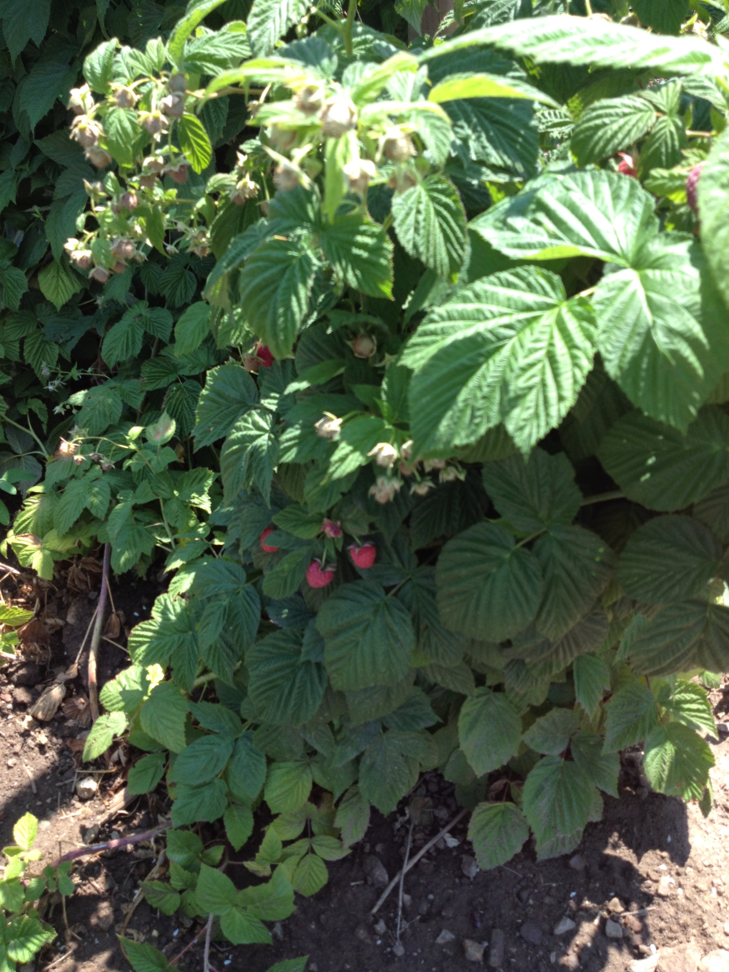 The raspberries are mostly underneath, and the bees are attracted to the flowers on top of the bushes.