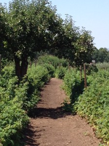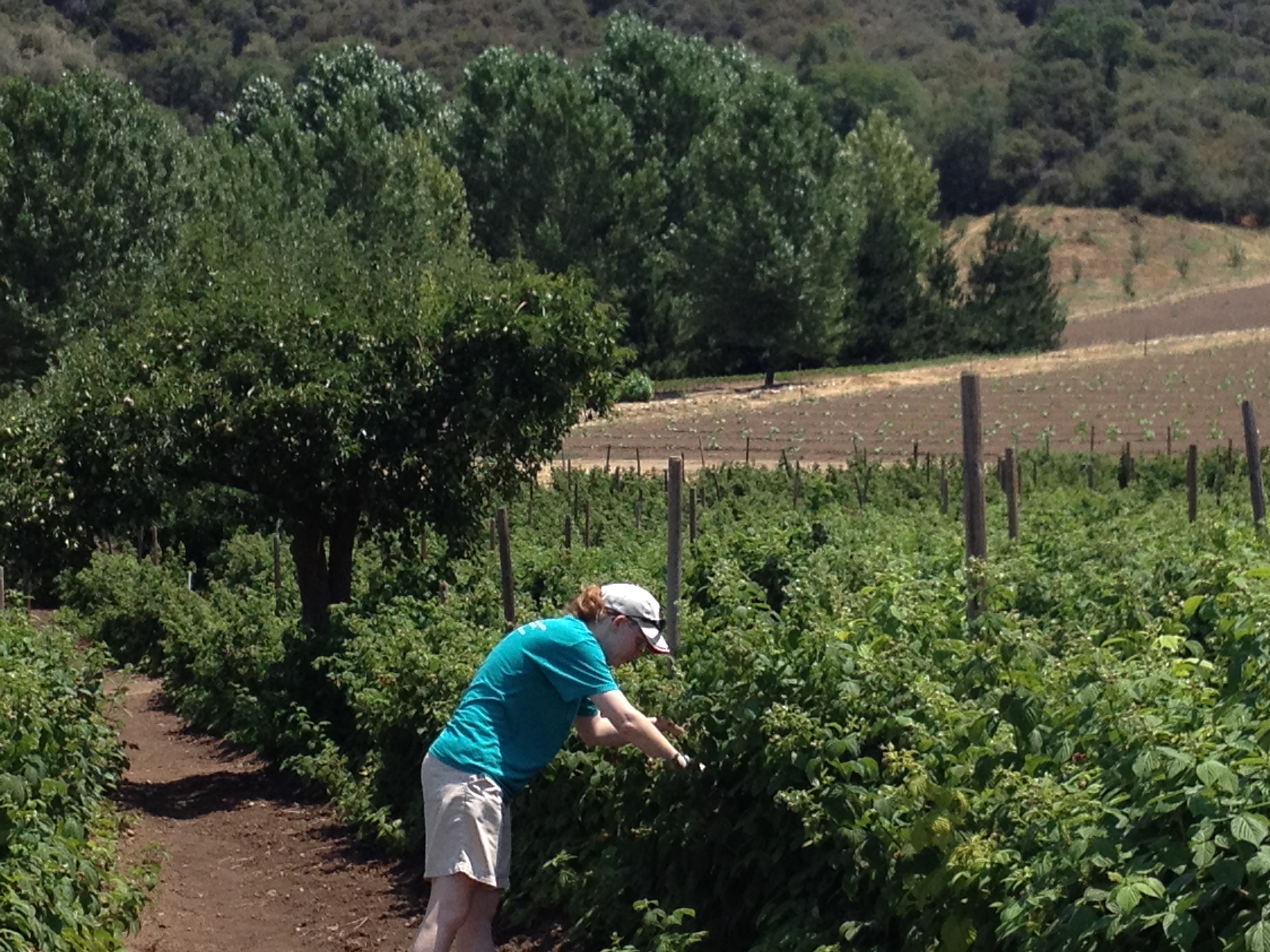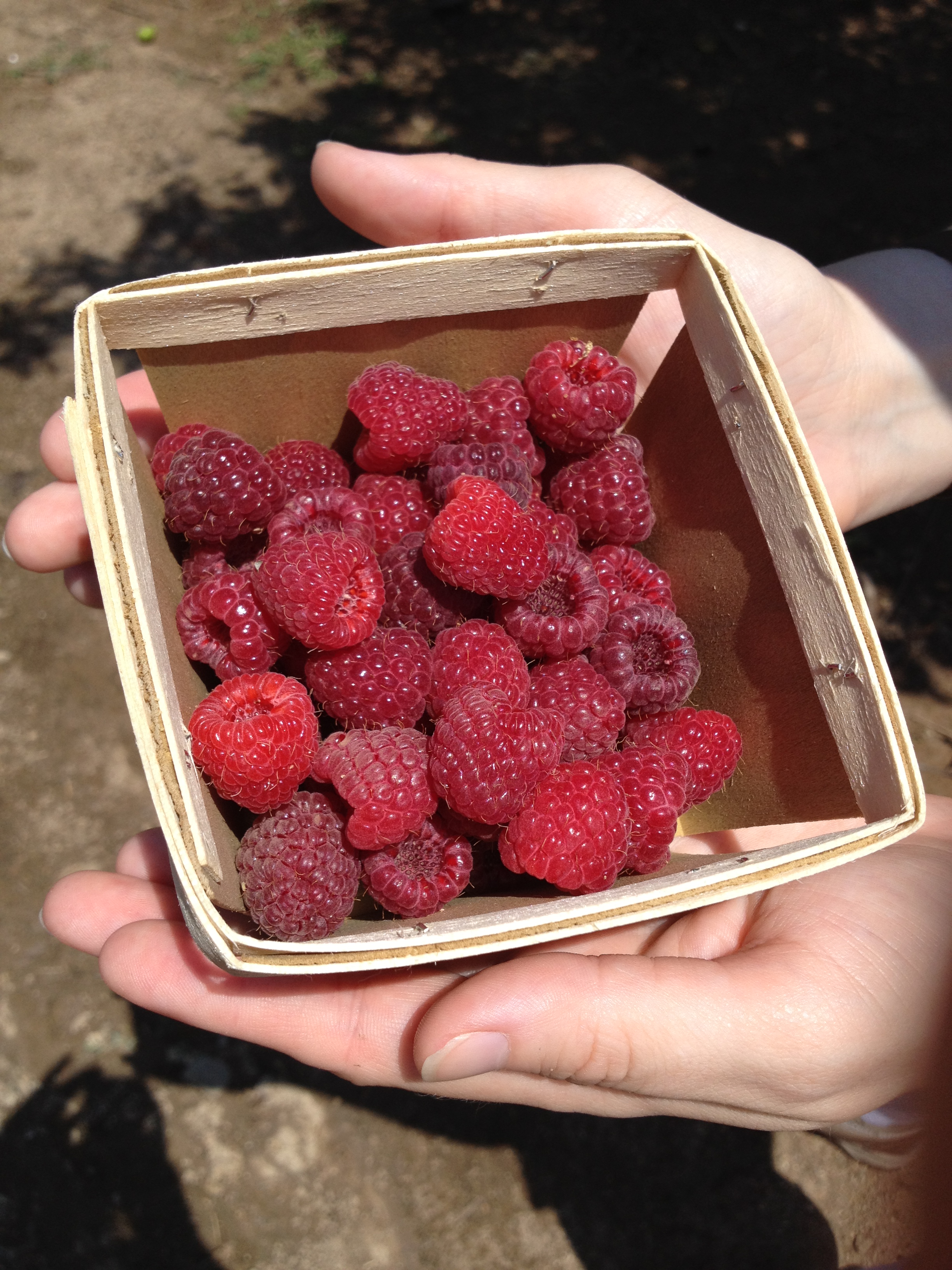 As Gina and I approached the raspberry fields you could begin to hear the faint humming of the bees. This is when my fear immediately kicked in! I’ve never seen so many bees in one place before! There were hundreds and hundreds of beings swarming the raspberries bushes. The entire time we were in the fields you could here their humming, and it took all my strength to not make sudden movements and stay put with Gina in the raspberry fields. The good part is the bees are not interested in the raspberries, but rather the flowers on the bushes. But I learned the extent of my fear of bees when I could only muster up enough courage to pick a total of five raspberries haha. Gina was the warrior in this round of fruit picking. She was fearless in going up to the bushes and filling up her basket with raspberries. And she was never stung nor even had a bee land on her. They were very uninterested in us. But I couldn’t get my fear to understand that rationale haha.