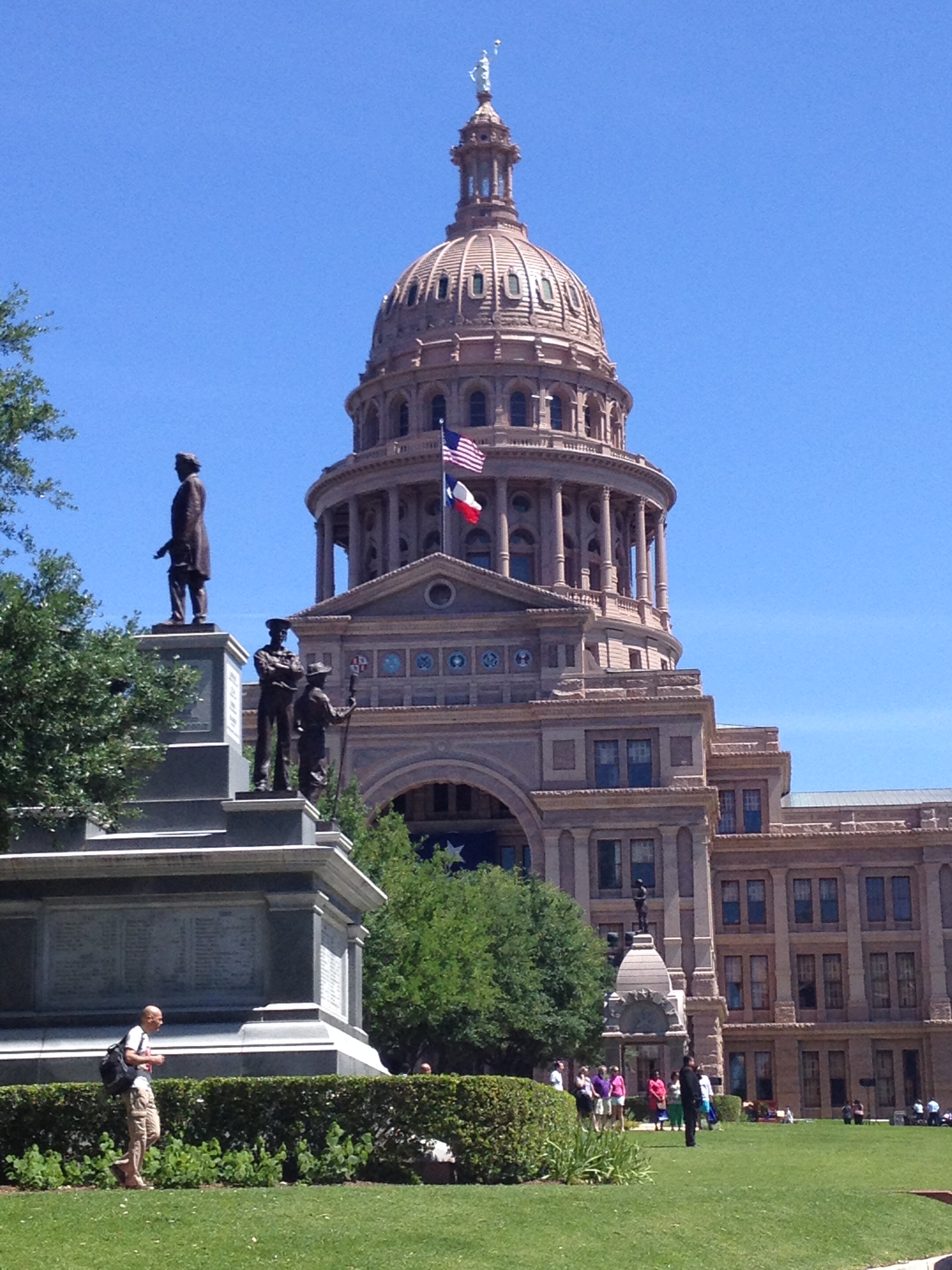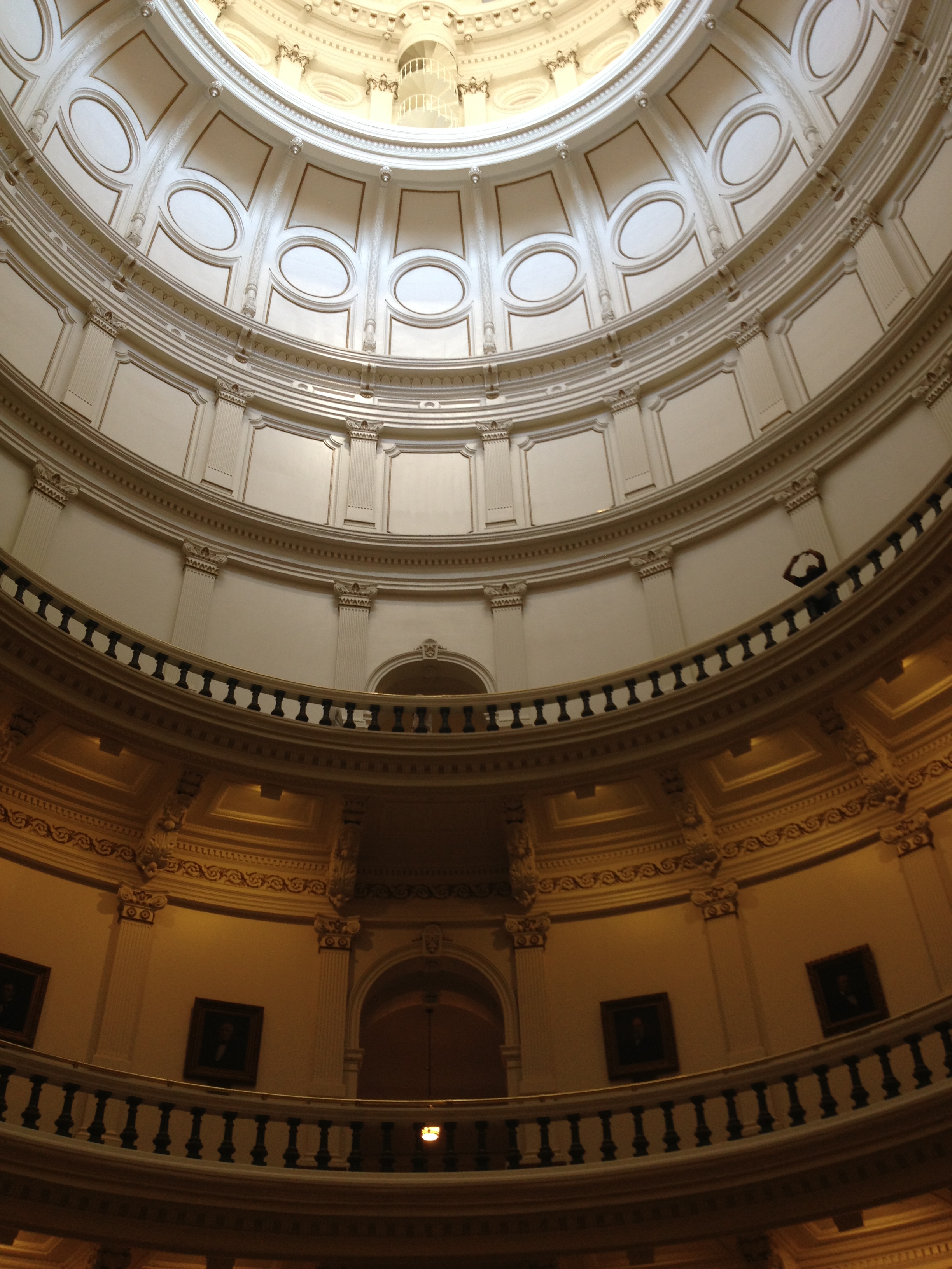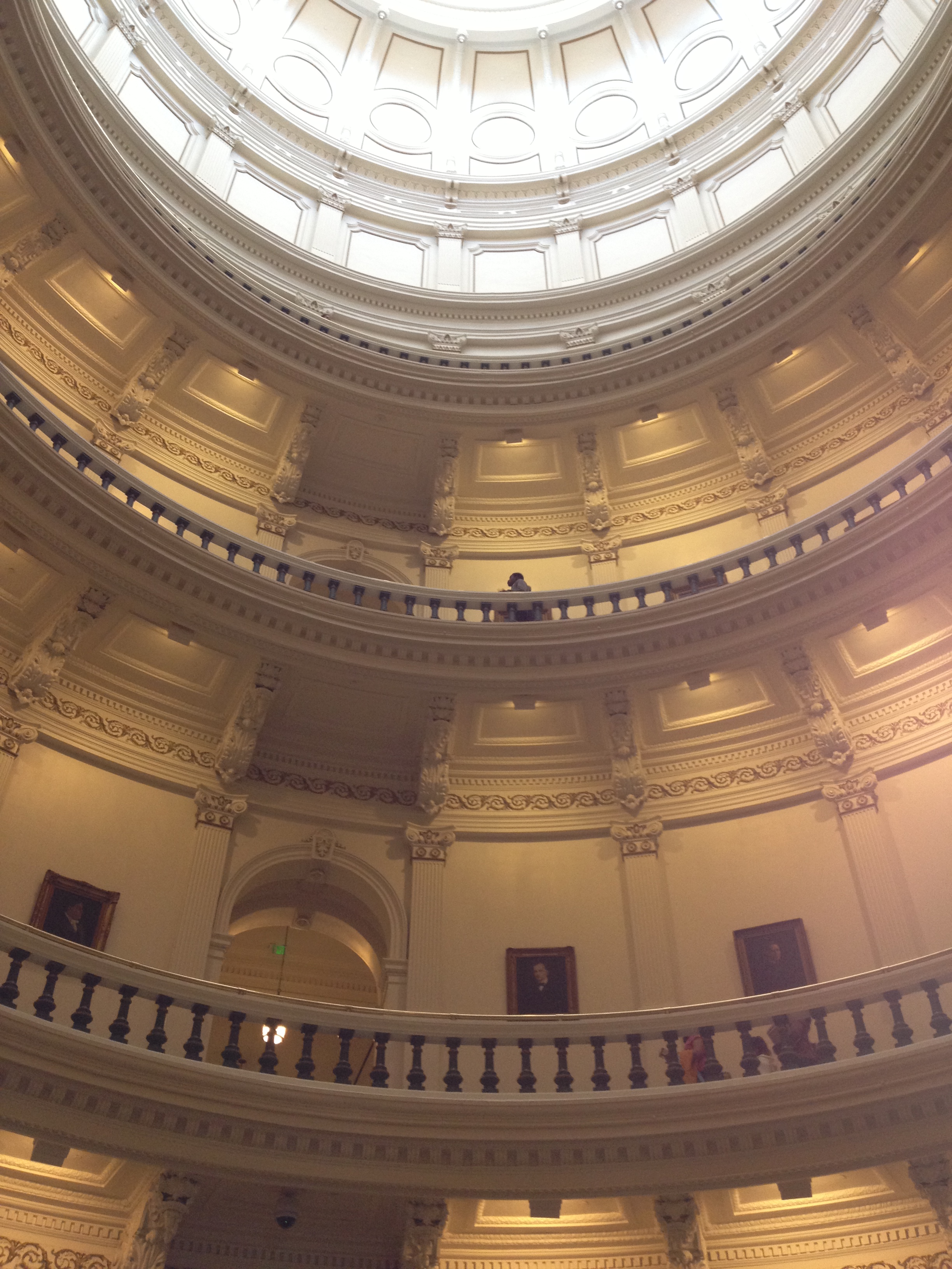 We had a lot to fit into 48 hours in Austin, so we were up and at ’em on Saturday. Our first stop of the day was the State Capitol Building in downtown Austin. Standing 14 feet taller than the U.S. Capitol (those Texans gotta do everything bigger!), it is a gorgeous pink granite structure that was completed in 1888. The “sunset red” granite was mined from Marble Falls, Texas, about 45 miles northwest of Austin. The Texas Capitol is the largest capitol at 360,000 square feet of floor space; though the tallest capitol is Louisiana’s, but our tour guide said they cheated because their capitol is a tower instead of the traditional dome haha. In 1993 the four-story, underground Capitol Extension was completed; since the site is protected as a historical landmark the addition had to be constructed underneath the Capitol. From the ground level you can hardly tell there is double the square footage as the original building lurking underneath.