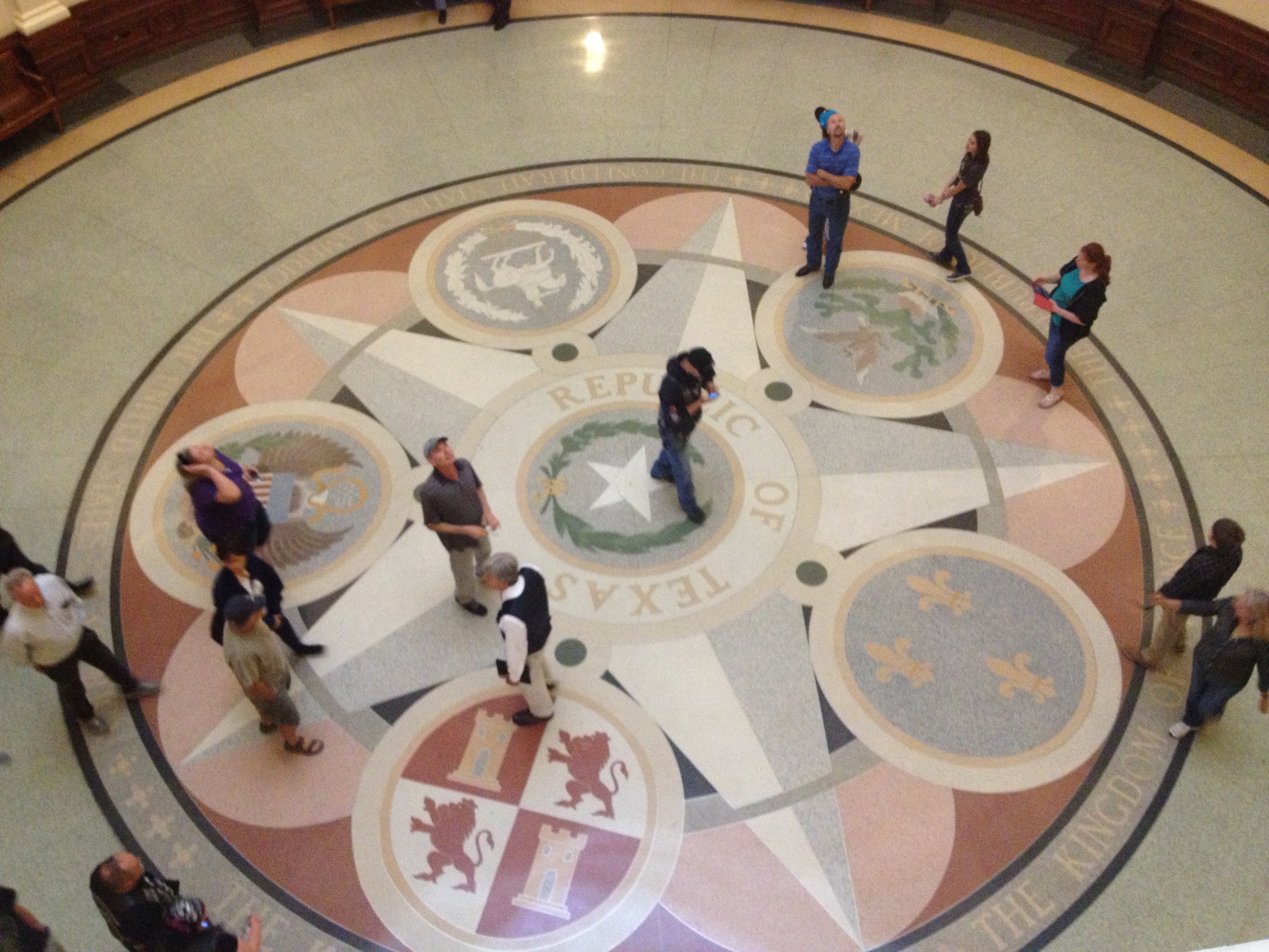 It was a busy day at the Capitol as it was one of the very rare Saturdays that the Senate and House of Representatives were in session. We wandered around on our own for a bit and then we hopped on a tour of the capitol building and had a great and funny tour guide. I didn’t know much about Texas’ history and learned a great deal from the tour. Have you heard the phrase, “the six flags over Texas”? I had (common example is the Six Flags amusement parks), but didn’t know what it meant. The six flags refer to the six nations that have governed Texas: Spain, France, Mexico, Republic of Texas, United States of America, and Confederate States of America. The seals of the Six Flags Over Texas are depicted in the mosaic on the floor of the rotunda. The flags are also shown on the reverse side of the Seal of Texas.