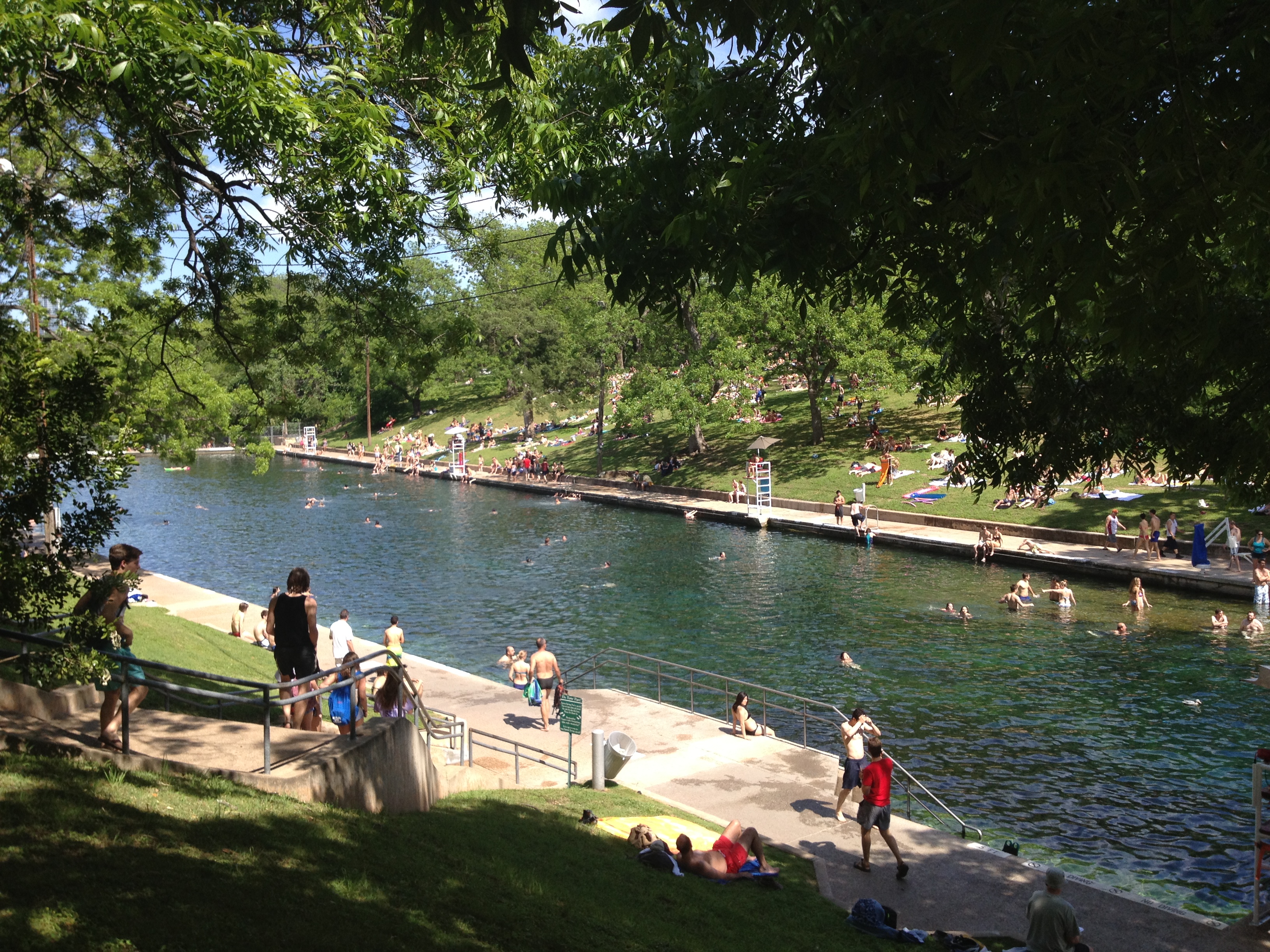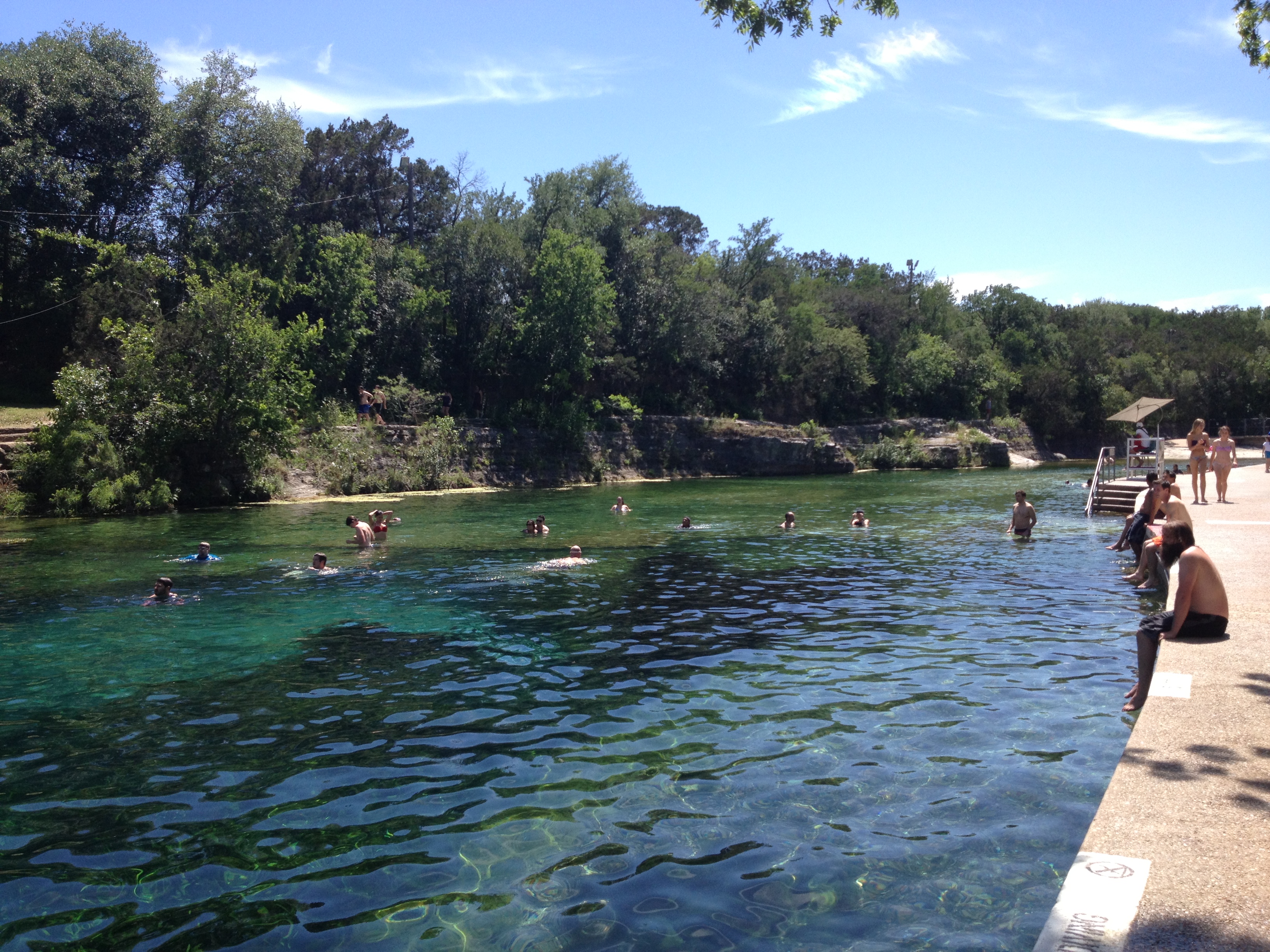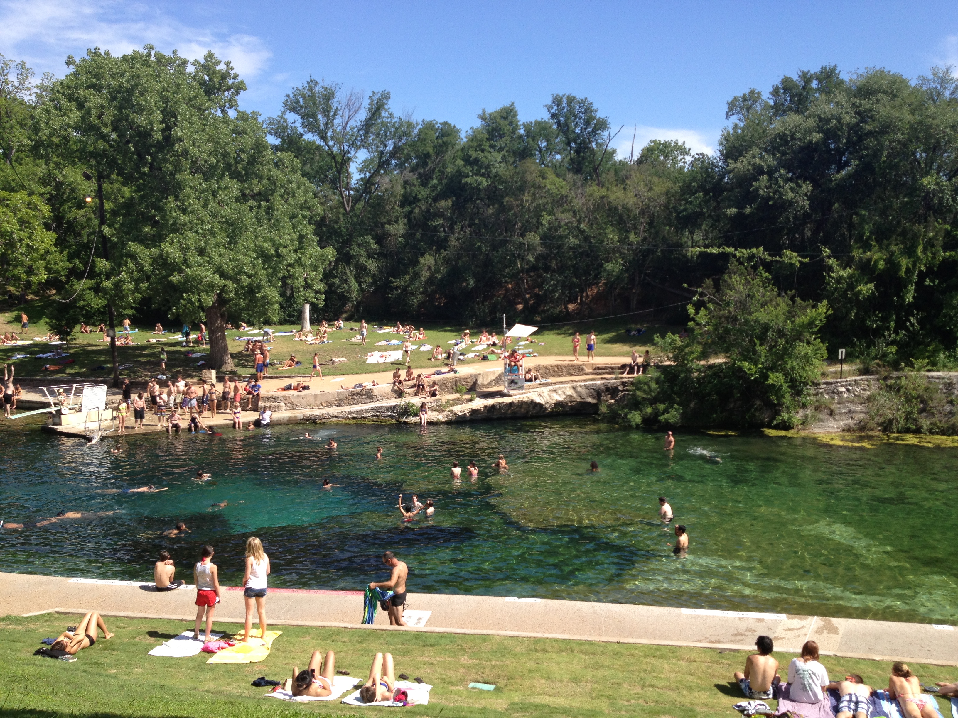 To cool off from the afternoon heat, we headed to Barton Springs Pool in Zilker Park. Though Barton Springs Pool is man-made, it sits in the channel of Barton Creek and is filled by water from Main Barton Spring (aka Parthenia), which is the fourth largest spring in Texas. The spring’s flow is located near the diving board, and keeps the pool at a near constant temperate range between 68 and 72 degrees.