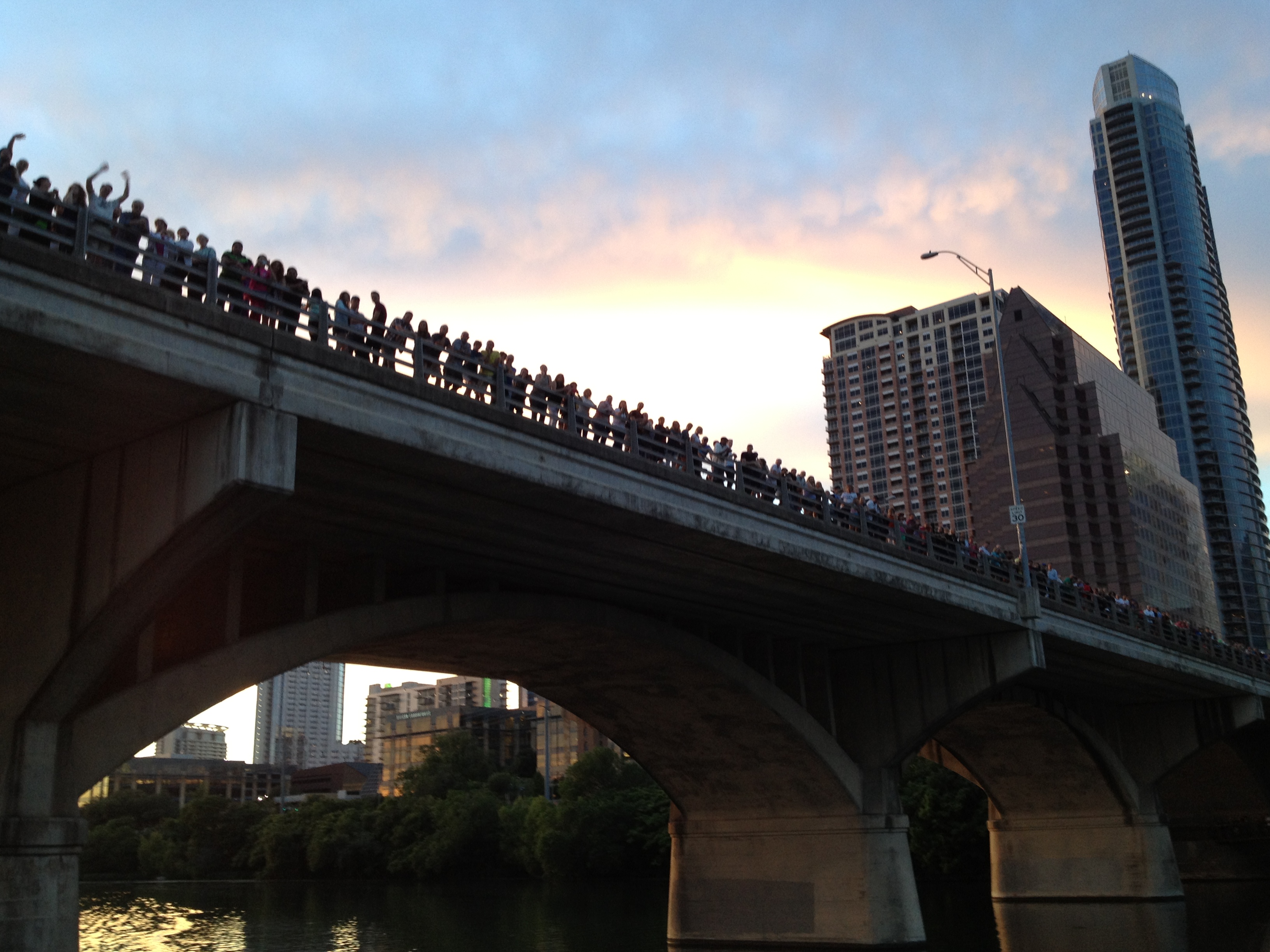 After enjoying the sun and cool water at Barton Springs, Hillary and I’s next stop on our Austin tour was to see the bats! Yes, I said bats. The bats of Austin are Mexican free-tailed bats and are the largest urban bat colony in North America. They reside under the Ann W. Richards Congress Avenue Bridge in downtown Austin which goes over Lady Bird Lake of the Colorado River. The bats moved in when the bridge was renovated in 1980, creating narrow but deep gaps between the concrete structures that provide perfect cave-like accommodations for the bats.