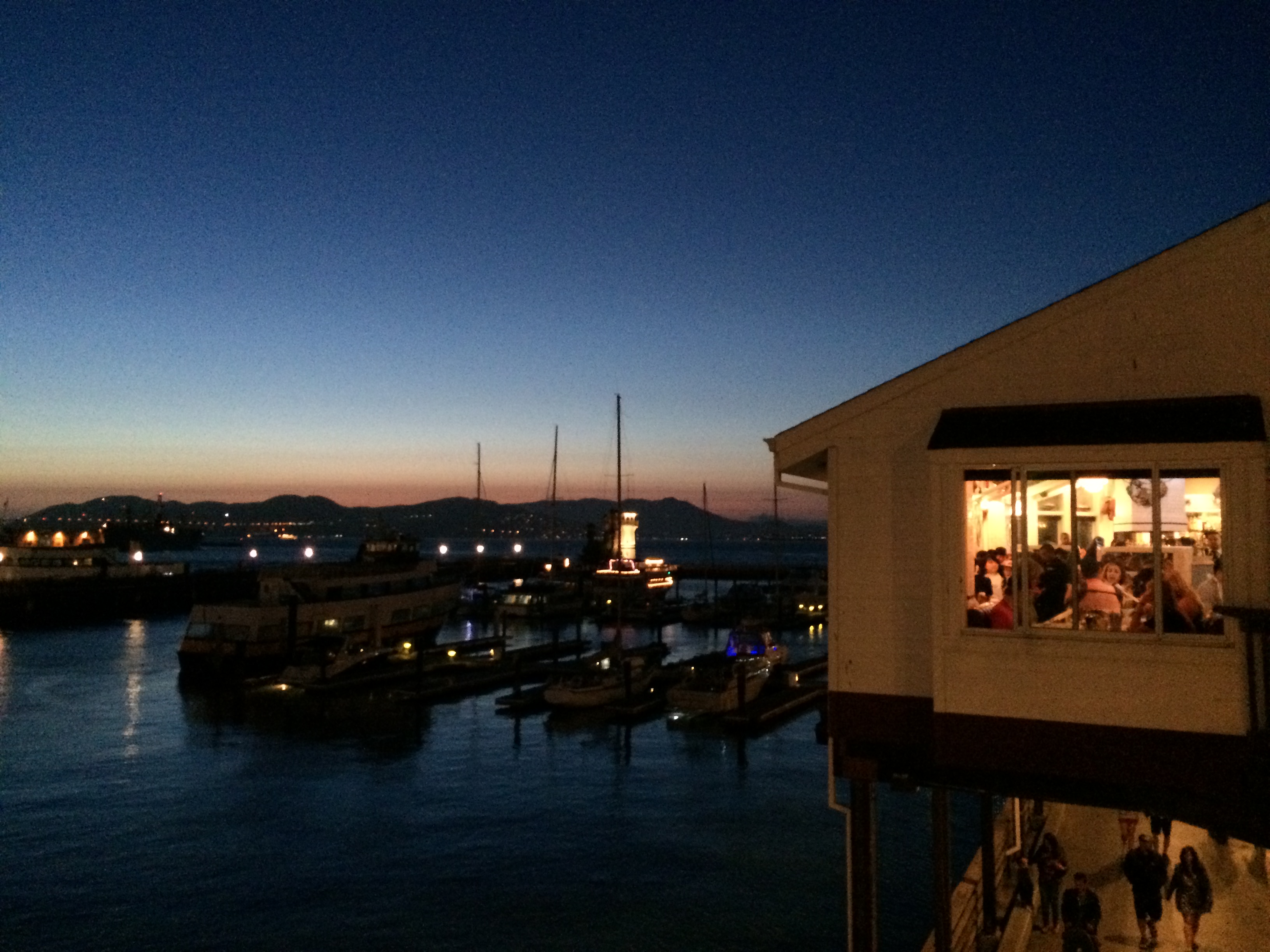 Next on the agenda was to get ourselves cleaned up for our fancy dinner at Pier 39. It’s a must to splurge on at least one nice seafood dinner while in San Francisco! While waiting for our table at Fog Harbor we sipped wine at the bar and chatted with a lovely elderly couple who frequents Fog Harbor. The woman told us the secret is to ask for extra clam in the “best in San Francisco” clam chowder. The locals always know the best tips! 🙂