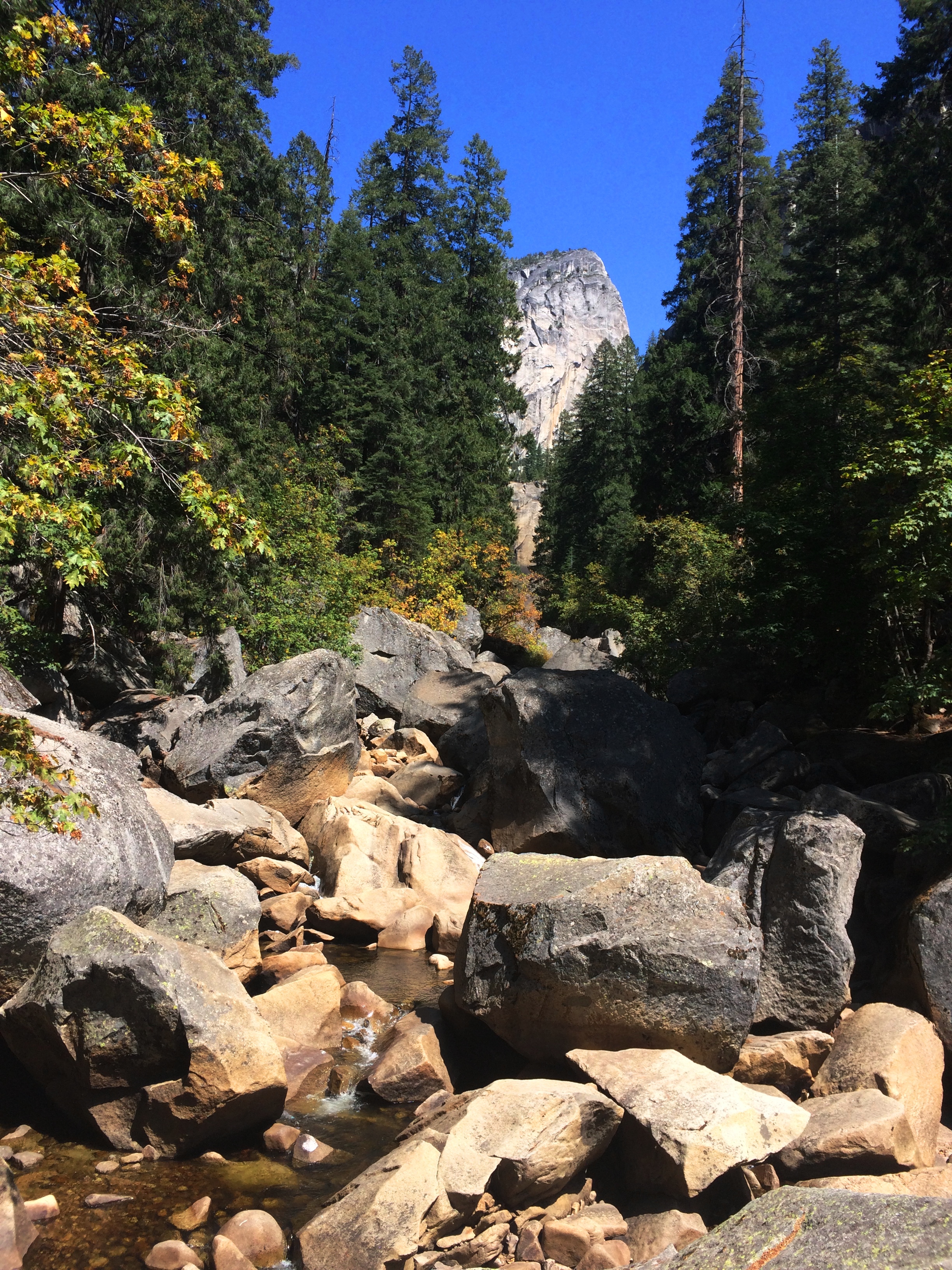 From Cook’s Meadow we hopped on the shuttle to Vernal Fall. This hike was our main exercise activity for the day and we would finally be able to see a waterfall! The Vernal Fall Footbridge hike is labeled as “moderate” but for me it was more strenuous due to me being out of shape haha. It’s 1.6 miles roundtrip and takes about 1-1.5 hours, though we hiked a little further up the trail past the footbridge. This is a very popular hike in Yosemite that takes you on the Johh Muir and Mist Trails which offer breathtaking views of two waterfalls, Vernal Fall and Nevada Fall. This scenic trail is almost entirely uphill (hence me making numerous stops) as it follows the Merced River with beautiful views across Yosemite Valley.