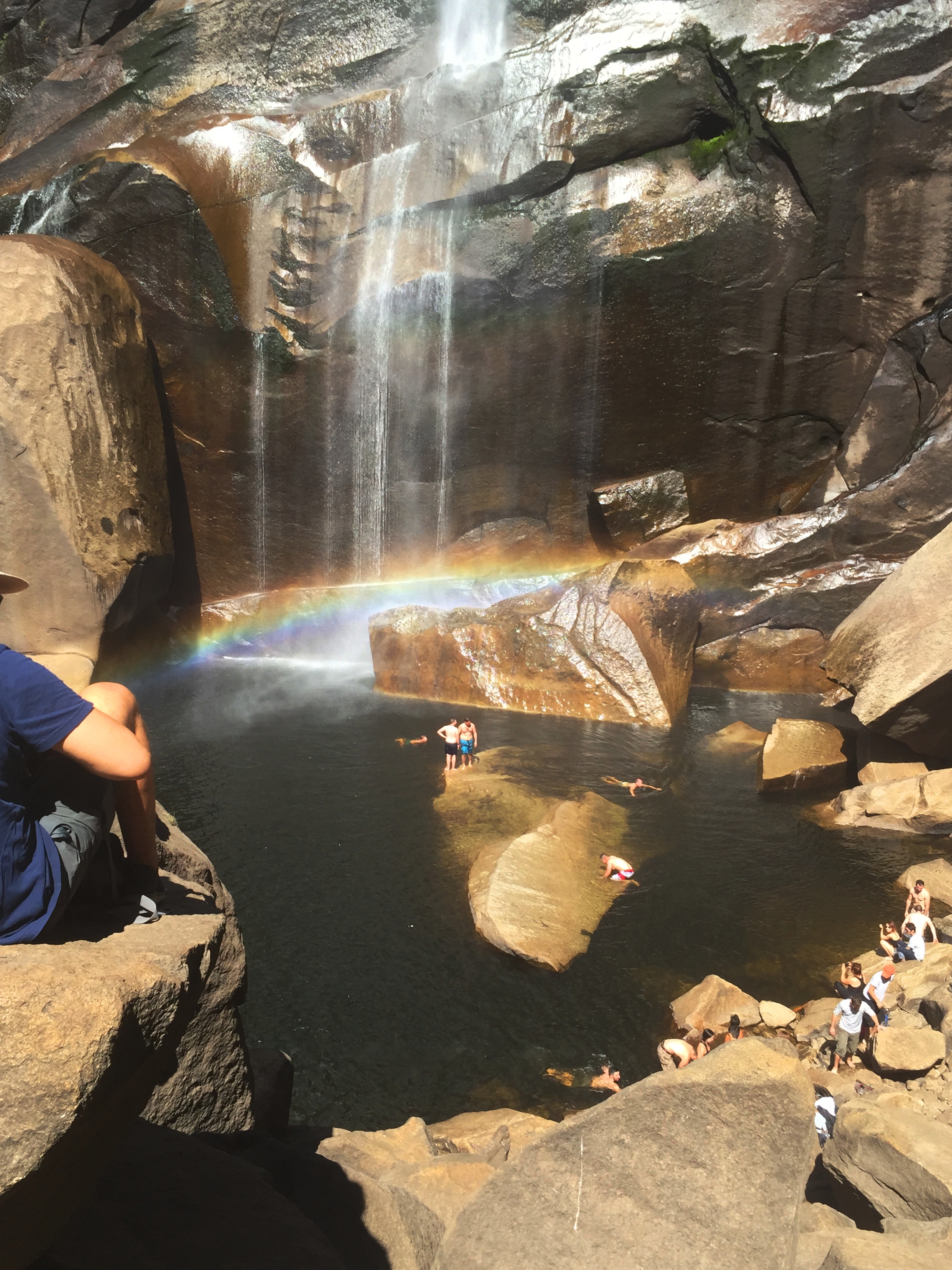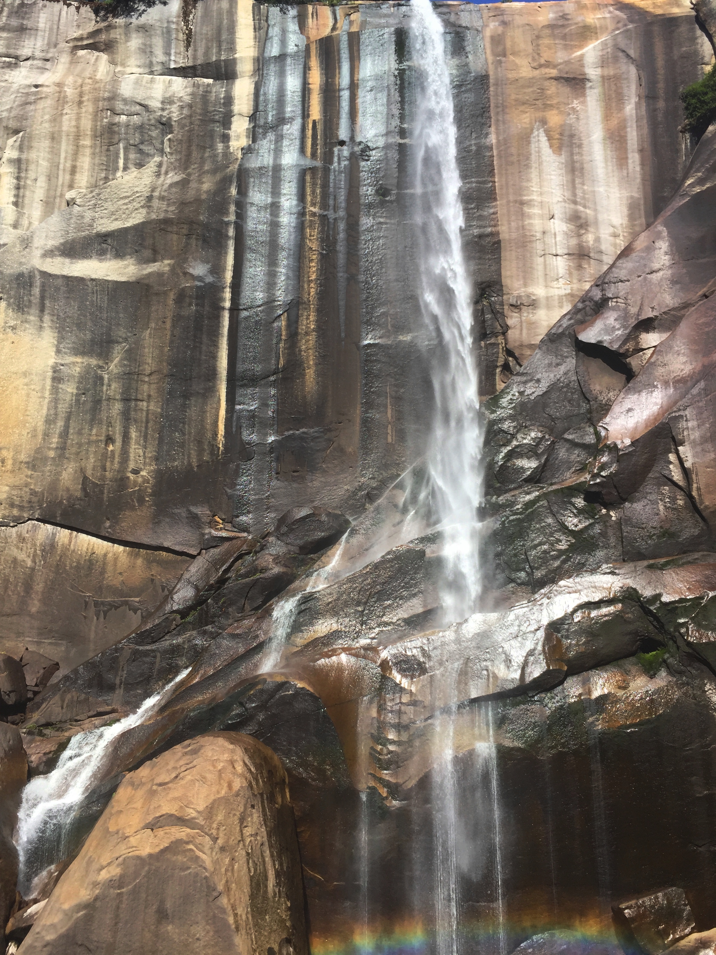 When you reach the footbridge at 0.8 miles you get a great view of Vernal Fall! There is also a large water fountain here and restrooms. From here if you continue on the steep trail you can reach the top of Vernal Fall, via the Mist Trail, and experience the cascading 317-foot waterfall from above which I imagine is spectacular! We only went partially up the Mist Trail to a stretch of the trail that offers closer views of Vernal Fall where we were treated to a rainbow! Lots of people hiked down to the pool at the bottom of the fall to cool off in the water but we opted to turn around and head back down the trail to the footbridge. If we continued on for another hour or so on the Mist Trail we would have reached the top of Vernal Fall. From there you can then turn around and go back the way you came, or continue up and take the longer way back via the John Muir Trail, or continue farther uphill on the Mist Trail to Nevada Fall.